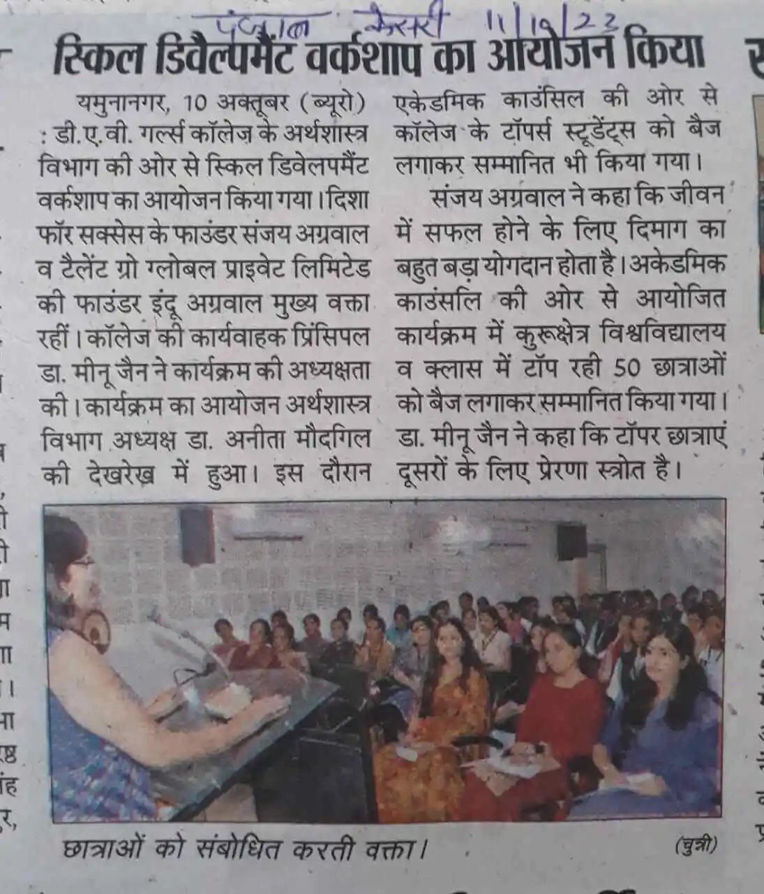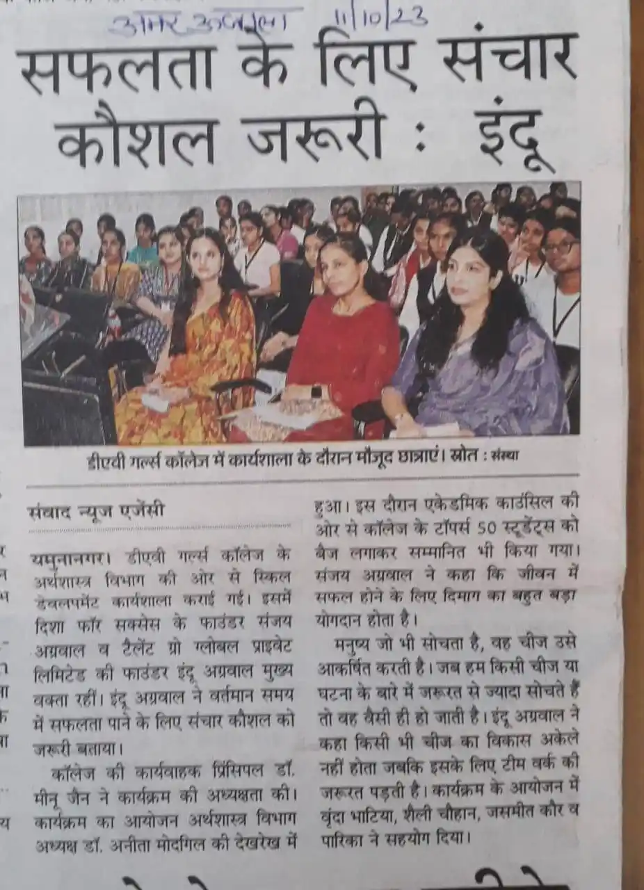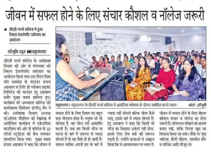 TalentGro Global workshop on communication skills at DAV Girls College, Yamunanagar, 11 Oct 2023.