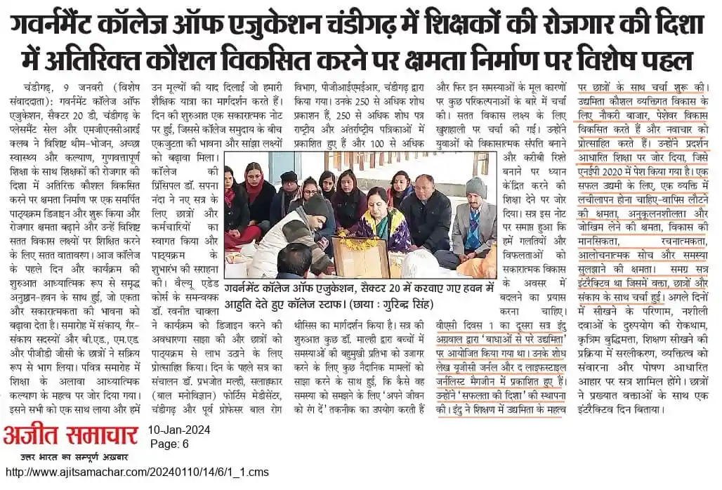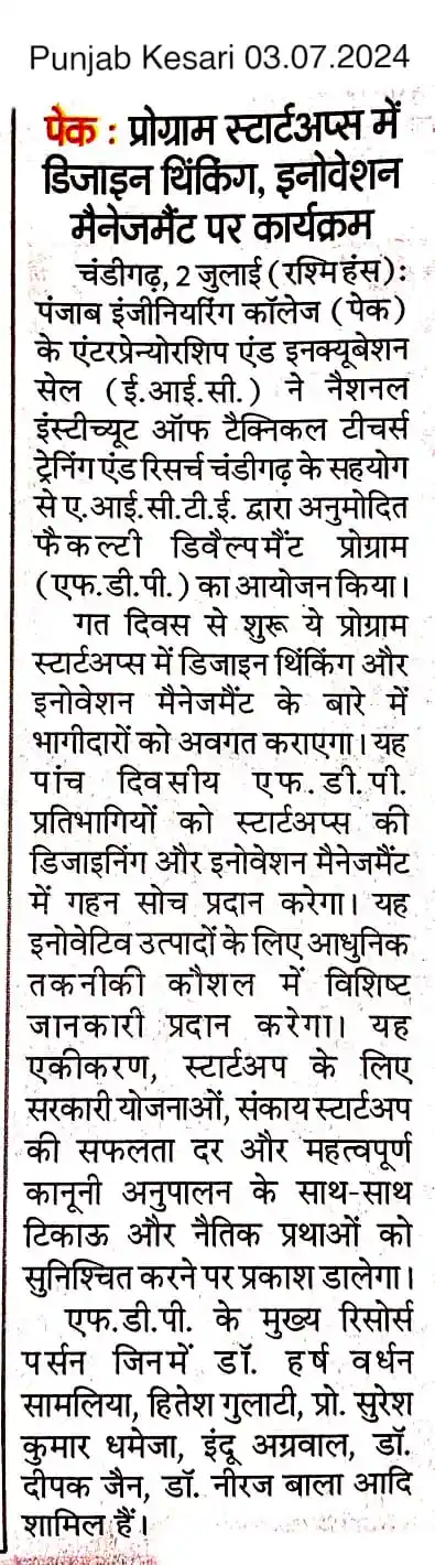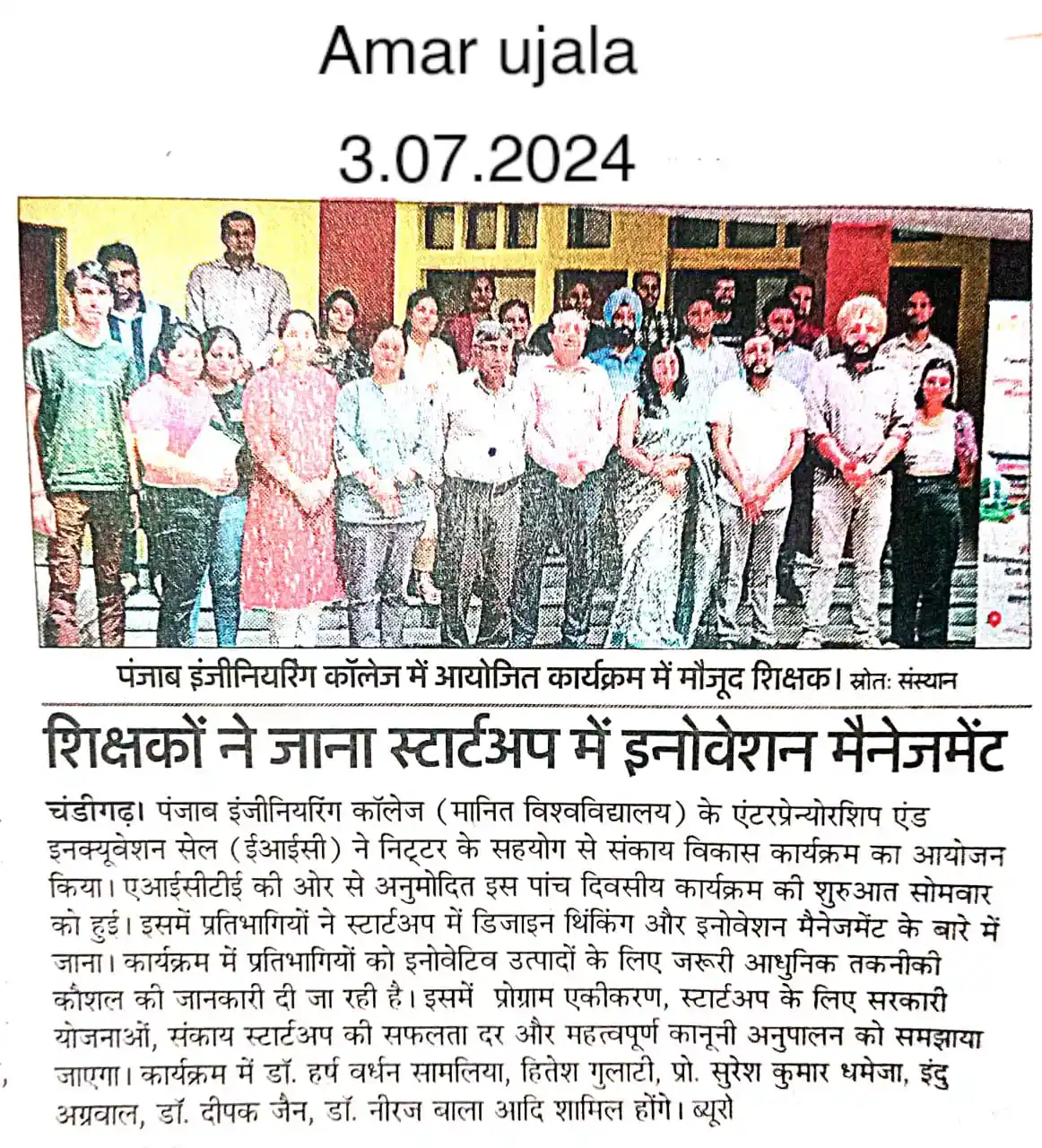 Punjab Engineering College Startup Innovation Management Workshop Amar Ujala News 2024 by TalentGro Global