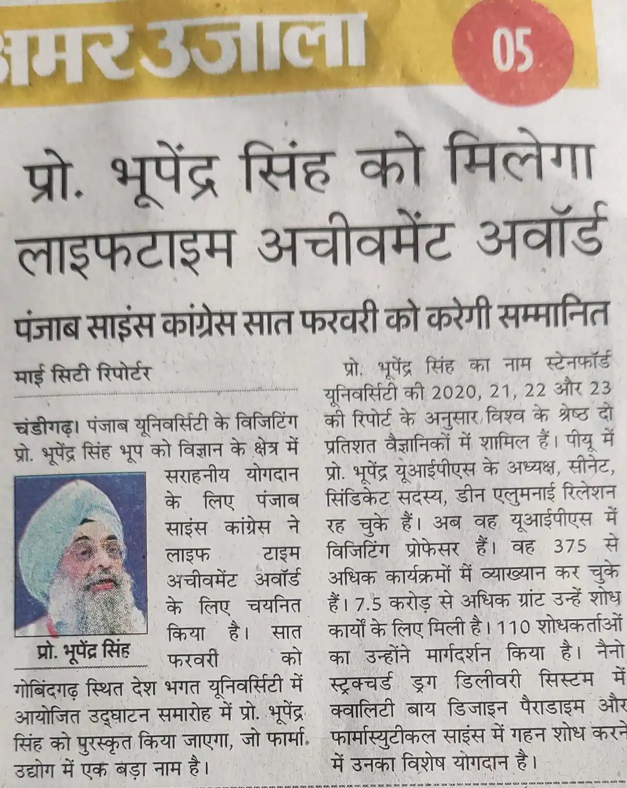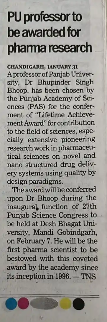 Prof Bhup Lifetime Achievement Award news Chandigarh Bhaskar February 2024 by TalentGro Global