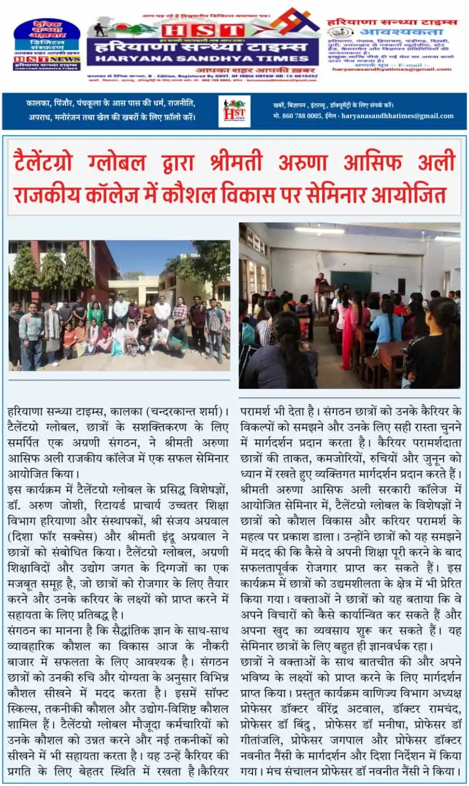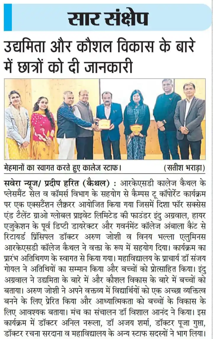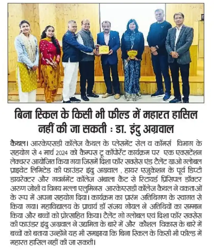 Entrepreneurship and skill development seminar at Arya PG College Kaithal by TalentGro Global
