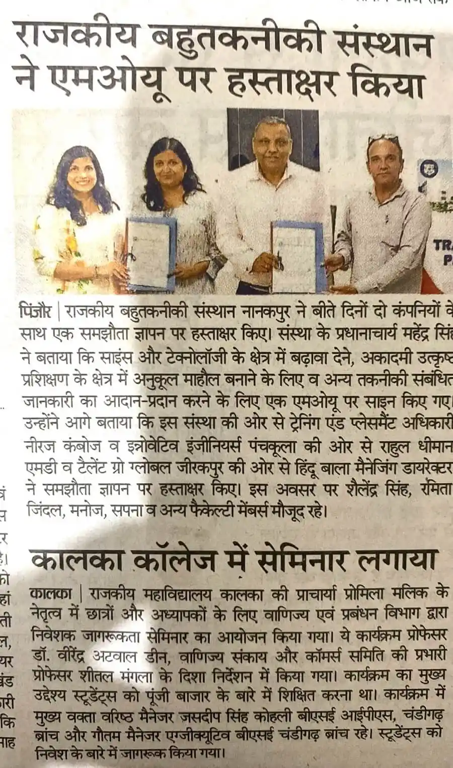 MoU signing ceremony at Rajkiya Polytechnic Institute by TalentGro Global covered in Hindi newspaper